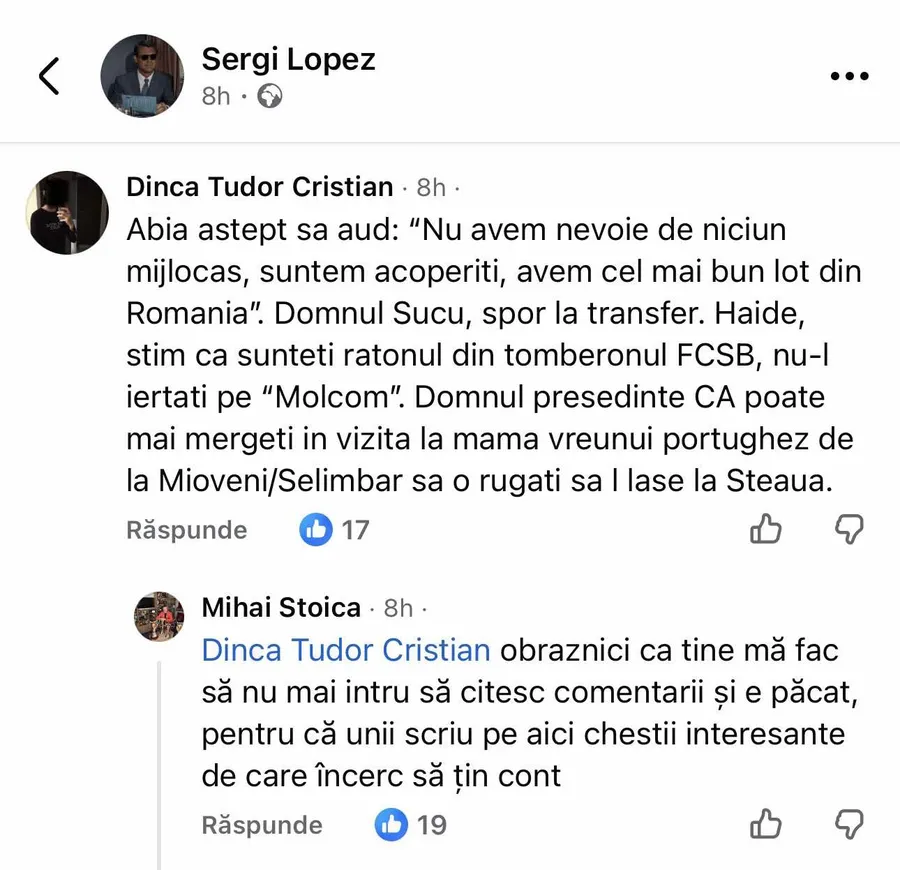 Fanul a acuzat conducerea că lasă un jucător important să plece, mai ales în condițiile în care se speculează că fotbalistul ar putea ajunge inclusiv la rivala Rapid. Acesta a criticat strategia clubului și a făcut remarci ironice la adresa lui Stoica, făcând referire la transferurile trecute ale echipei.